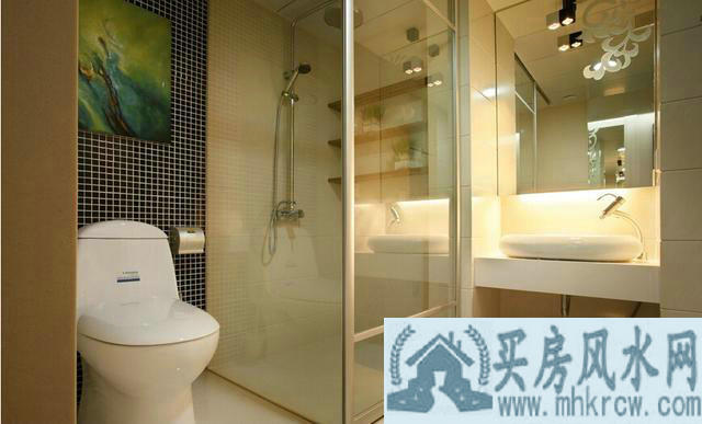 如果浴室没有对外的窗户,那堋可以在墙上挂面镜子以形成一个想像空间。,镜子能加速气能的流动,对浴室而言,具有正面效果,因为浴室最忌空气不流通。浴室中最理想的色调是粉色系,例如粉红、淡绿、淡蓝及桃红色等。则是奶油色系,或是一些中性色,如黑色及白色。装饰物及毛巾等配件则可选择强烈的对比色系。墙面的处理方式应该是尽可能地富有想像力,要不就尽量求简。在水泥墙上涂上一层油漆会使浴室增添暖度,而马赛克玻璃砖,刻花磁砖,甚至板舌以及凹槽处理都能使墙壁的设计更为有趣。