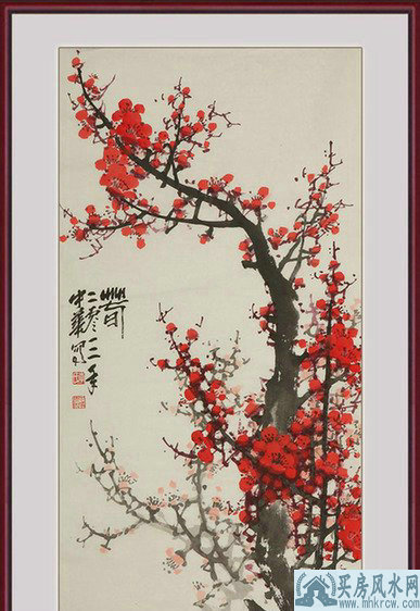 这是一幅三尺竖梅,火红梅花寓意红红火火,俗话说“梅花开五瓣,寓意福、禄、寿、喜、财”,画面中虽然呈现的只是一枝梅,但梅花虚实结合,使人不禁会想到其实在这枝梅的后方肯定是一团红似火的梅林,梅花点点,喜事连连,挂在家中和客厅相当不错,它寓意着日子会过得蒸蒸日上,红红火火。而且,自古以来,梅就是诗人的爱物,它是四君子之一,咏梅赞梅的诗句多不胜数,如“宝剑锋从磨砺出,梅花香自苦寒来”、“不是一番寒彻骨,怎得扑鼻梅花香”,梅的品格一直都是大家有目共睹的,所以呢,此幅佳作送给那些莘莘学子也会起到很不错的激励作用的。“竹如君子梅似佳人”,俏红的腊梅一直也都是佳人的代表,“梅妻鹤子”的典故很是经典,送给女性朋友也是很是合适的。火红的腊梅,自有它非凡的视觉魅力和精神品格魅力!